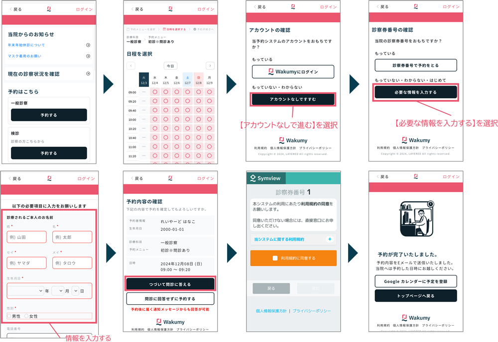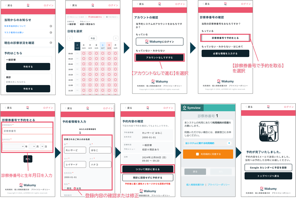予約が完了しましたら画面の指示に従って受診前にWEBでの問診システムのご記入をお願いしております。